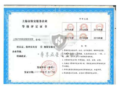 2014—— 被上海保安服务行业协会评为一级保安服务资质,成为上海保安服务行业首批取得一级资质的企业。